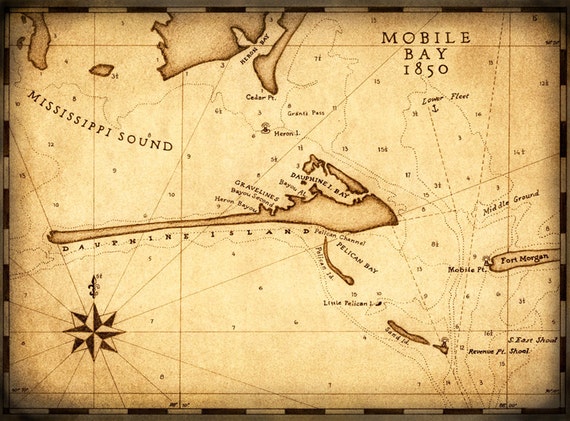 Dauphin Island Map Art C. 1850 Hand Drawn Map Art Gulf of Mexico